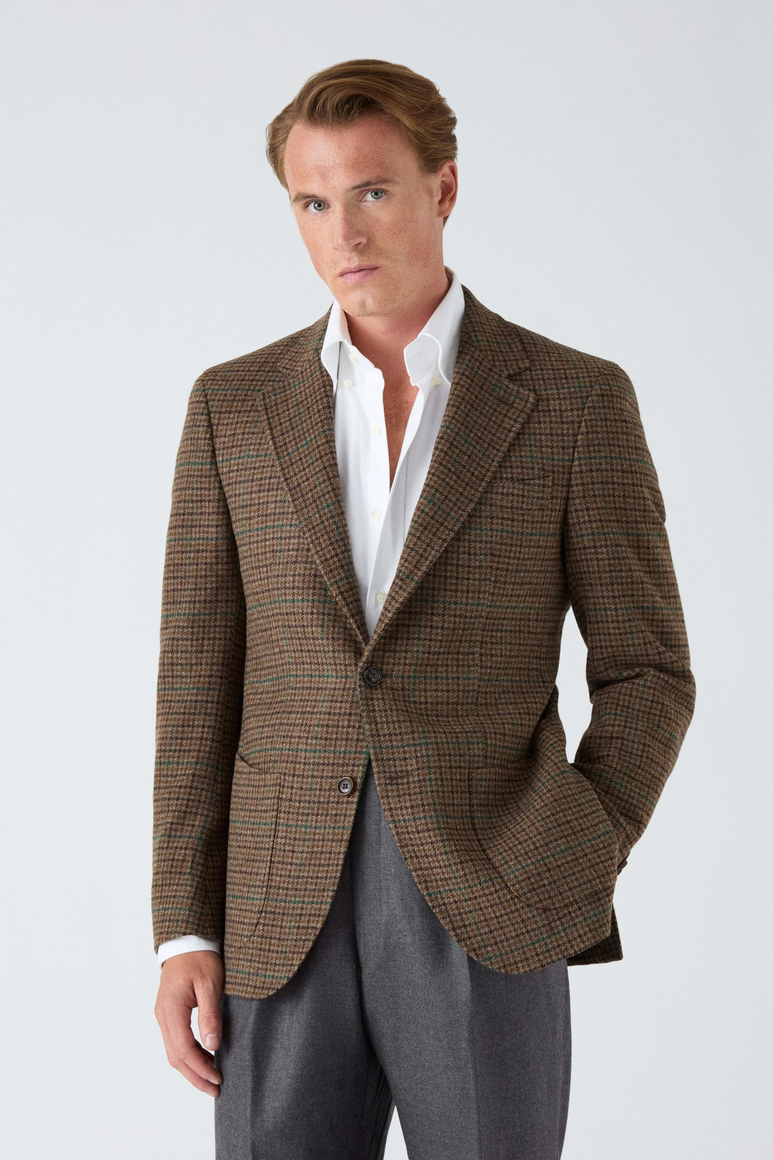 To achieve what we consider an ideal torso shape, our house style is cut fuller through the body, with a broad lapel and a nipped waist, slightly more generous than in previous seasons. A longer length and lower buttoning point add balance and subtly elongate the silhouette. Made with a half canvas construction and finished with thoughtful details such as curved patch pockets and functioning cuffs, it is crafted from an English wool cloth, woven in Yorkshire for Berg & Berg.