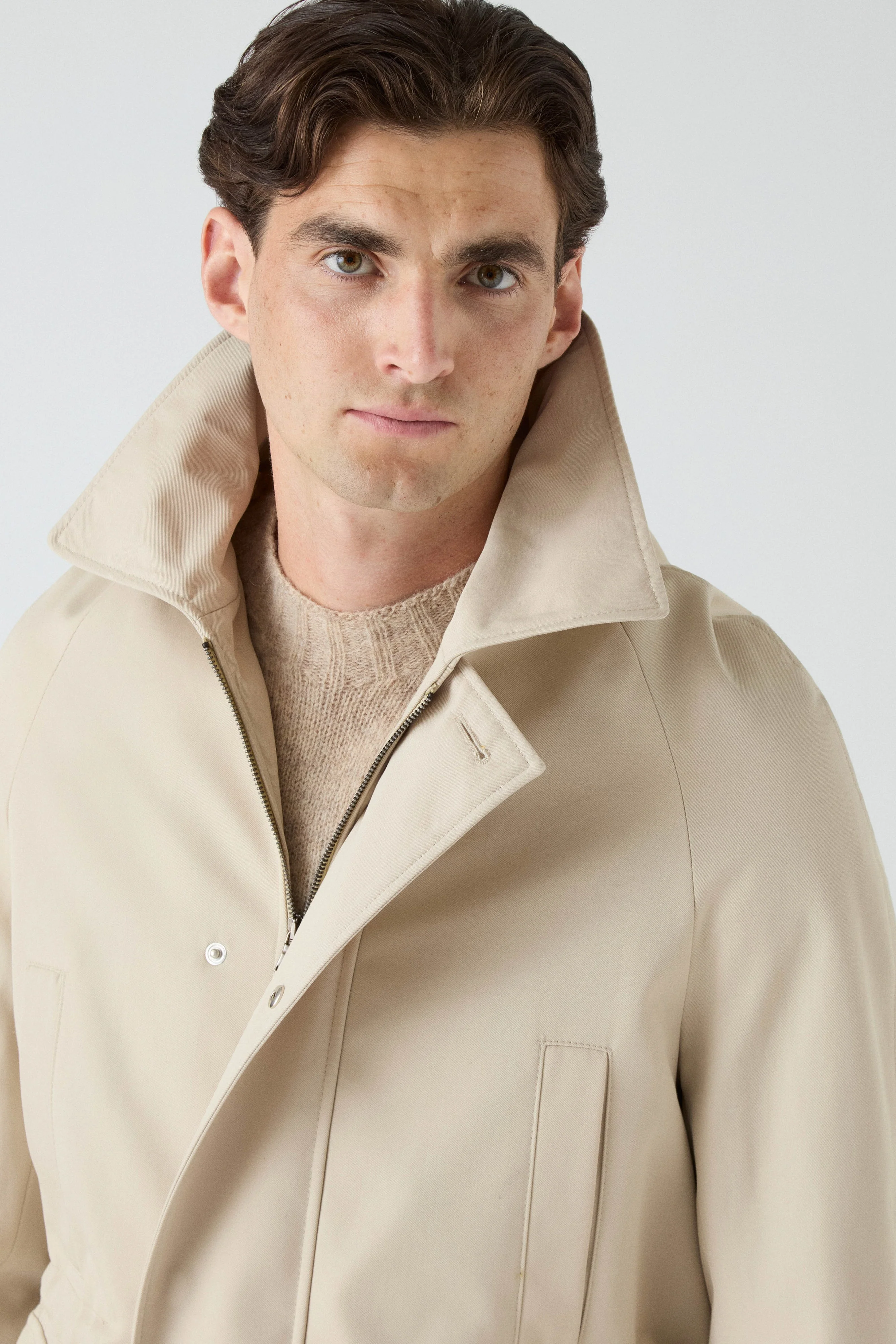 Cut with a raglan sleeve and a generous silhouette, Nils features a drawstring waist for a relaxed, slouchy fit. The front is detailed with oversized patch-flap pockets, handwarmer pockets, and a cosy storm flap, while the back is finished with a storm shield-style cape back for added protection against the elements. Expertly crafted from a water-resistant cotton blend, the jacket is long enough to layer over tailoring, yet short enough to feel modern and sporty.