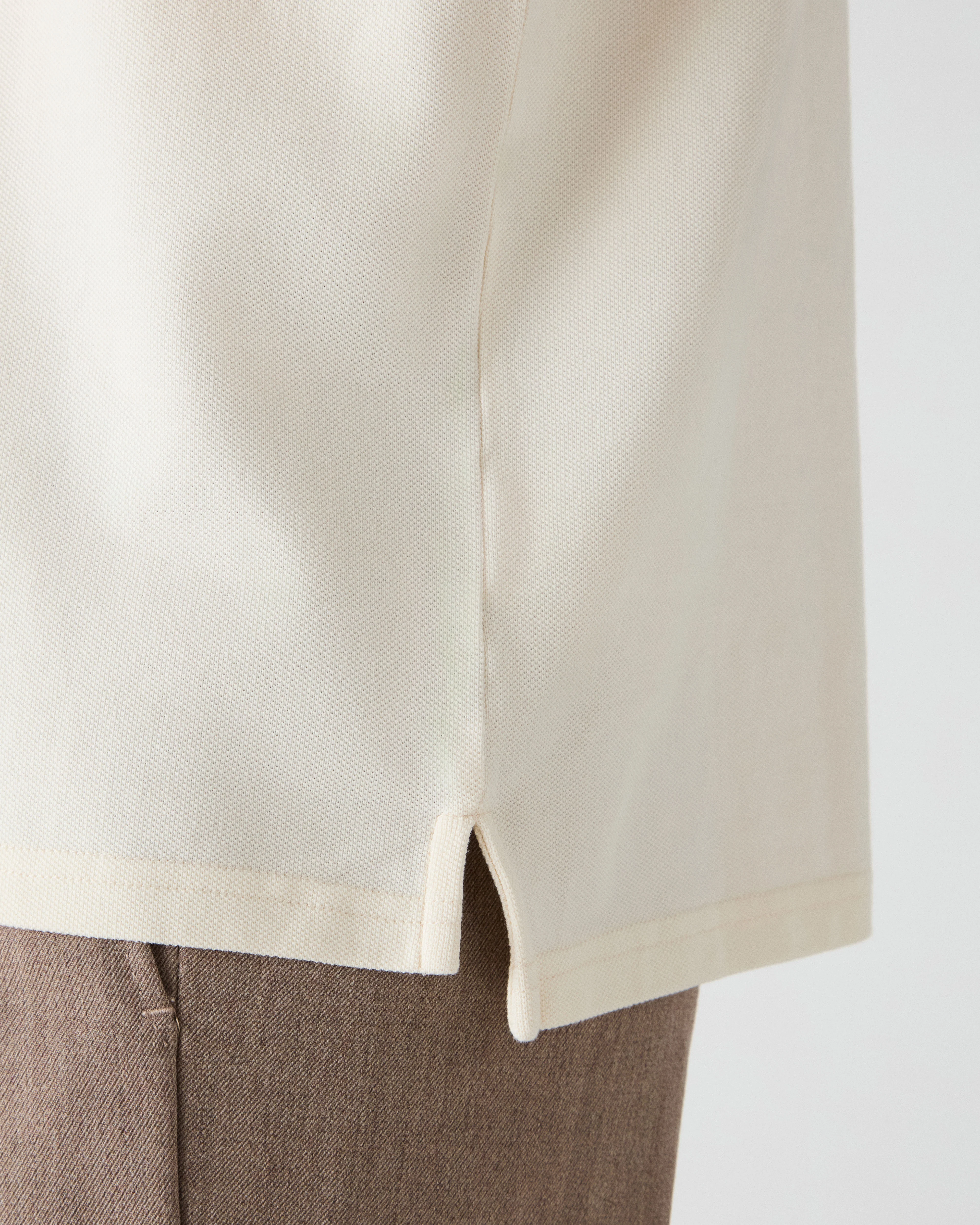 Using that classic polo shirt staple - cotton pique - as a starting point, Teddy takes a gently sartorial approach to casualwear, with an extended placket, horn buttons, and an elegantly pointed collar. A chest pocket and ribbed cuffs complete the design.